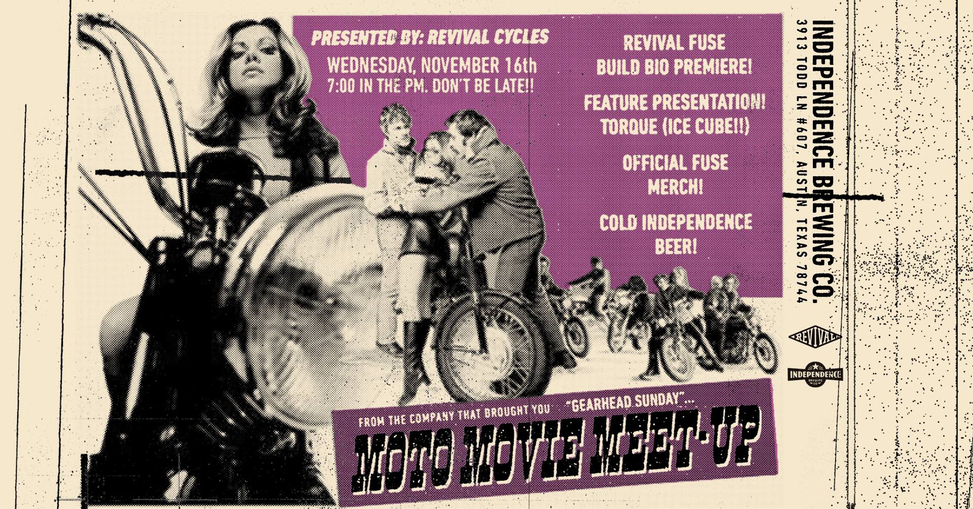 The next Moto Movie Meet-up is just around the corner. Wednesday, November 16th, at Independence Brewing, we’ll be premiering our Fuse Build Bio and showing Torque! Get out and have some campy fun with this stunt-filled action flick. Starring Ice Cube with appearances from John Doe, Adam Scott, and Jaime Pressly, you don't want to miss it. Fun fact: the Jet Turbine bike in the movie is real, and our buddy Jay Leno owns one. #truestory