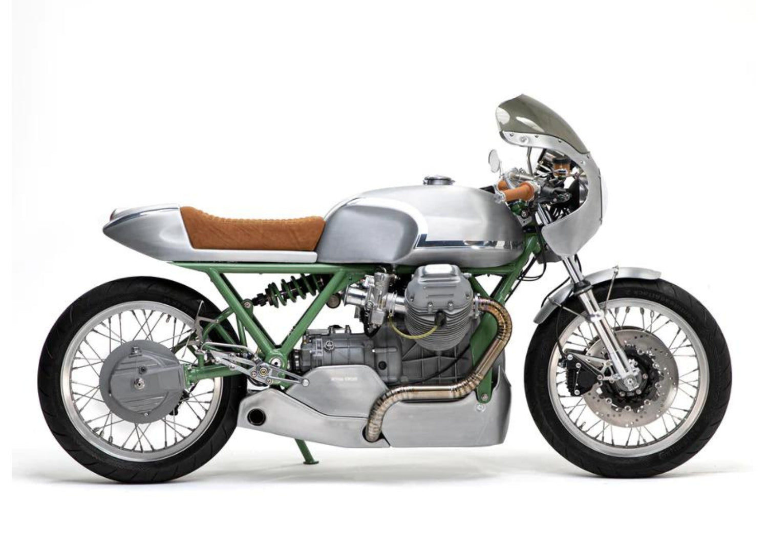 After a trip to Lake Como and visiting the Moto Guzzi factory and museum, the owner was inspired by the V8 dustbin Guzzi color. To pay tribute to such an inspiring piece of racing history, the frame of the Alloy Guzzi was finished in an industrial green to mimic the dustbin fairing color, while the rest of the bodywork was left raw, minus a small polished reveal gives the bodywork a finished look. The owner also opted for a fully safety wired bike, which hints at the motorcycle’s future on the race track.