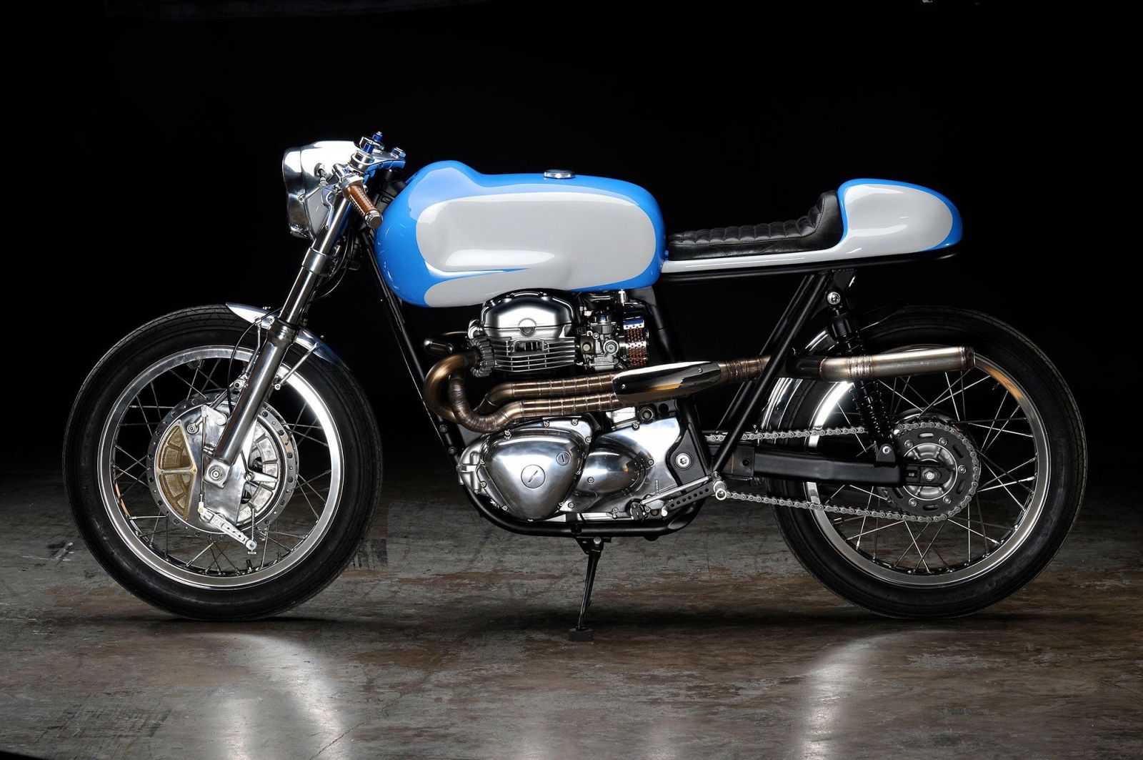 The aluminum bodywork was then bodyworked and covered in blue and gray for another juxtaposition in modern and classic colors to compliment the hand-formed polished fenders to complete the bike’s look.