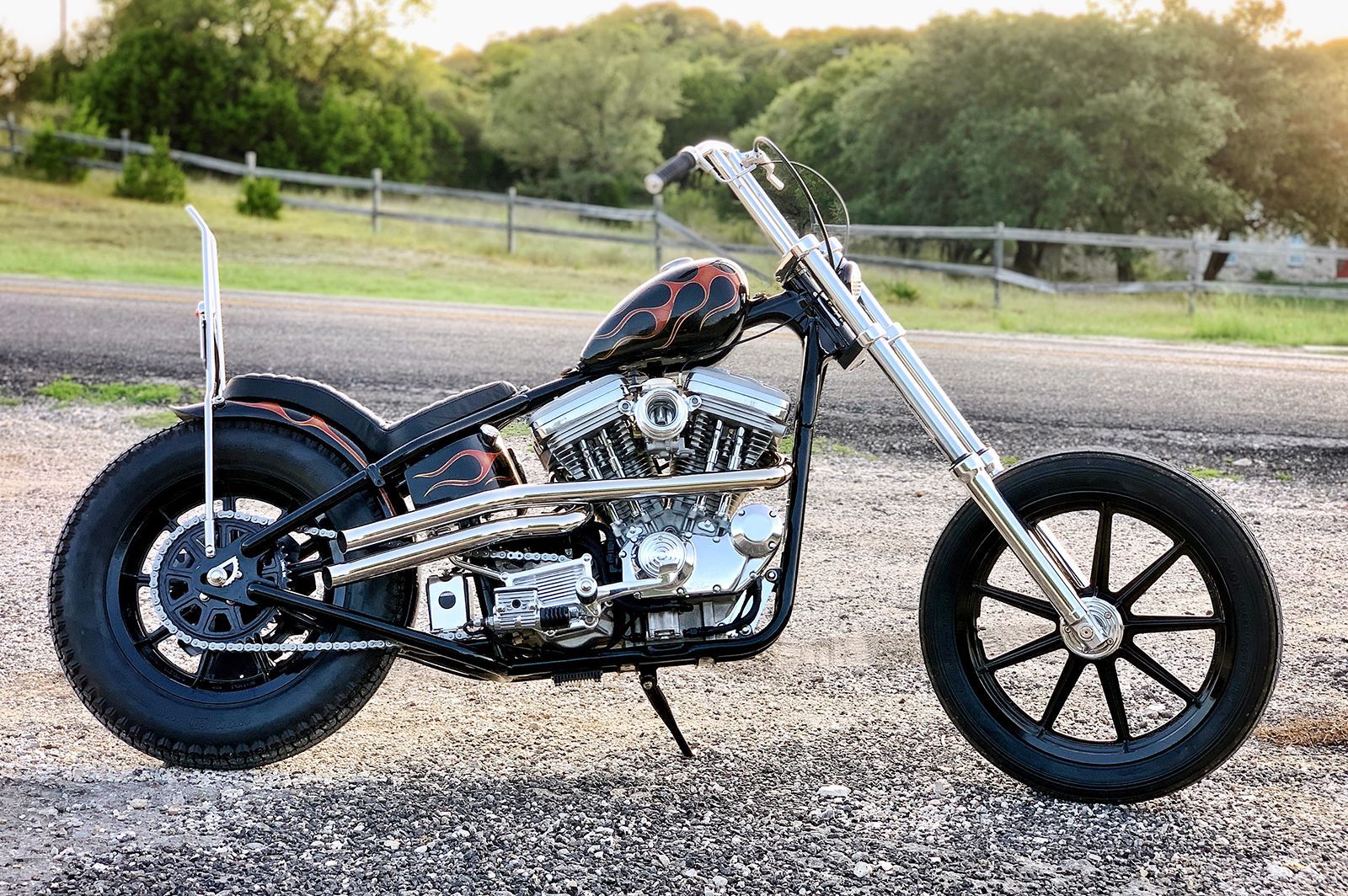 He completely rebuilt and vapor-blasted the motor, and re-polished all the covers. He fitted S&S pushrods and lifters, as well as Andrews cams and EMD ribbed rocker covers. The engine breathes through a Killer Performance-built CV carb. He fitted a Barnett clutch and throttle cables, and used a Lyndall sprocket and brake rotor.
